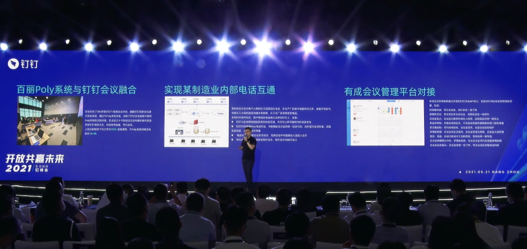 在会上,王铭特别讲解了在疫情期间被广泛应用并颇受好评的“钉钉全场景会议解决方案”:超过1亿客户的同时并发在线,同时支持2000w+在线会议,服务超过1000w+企业,提供302同时在线的免费的音视频能力。