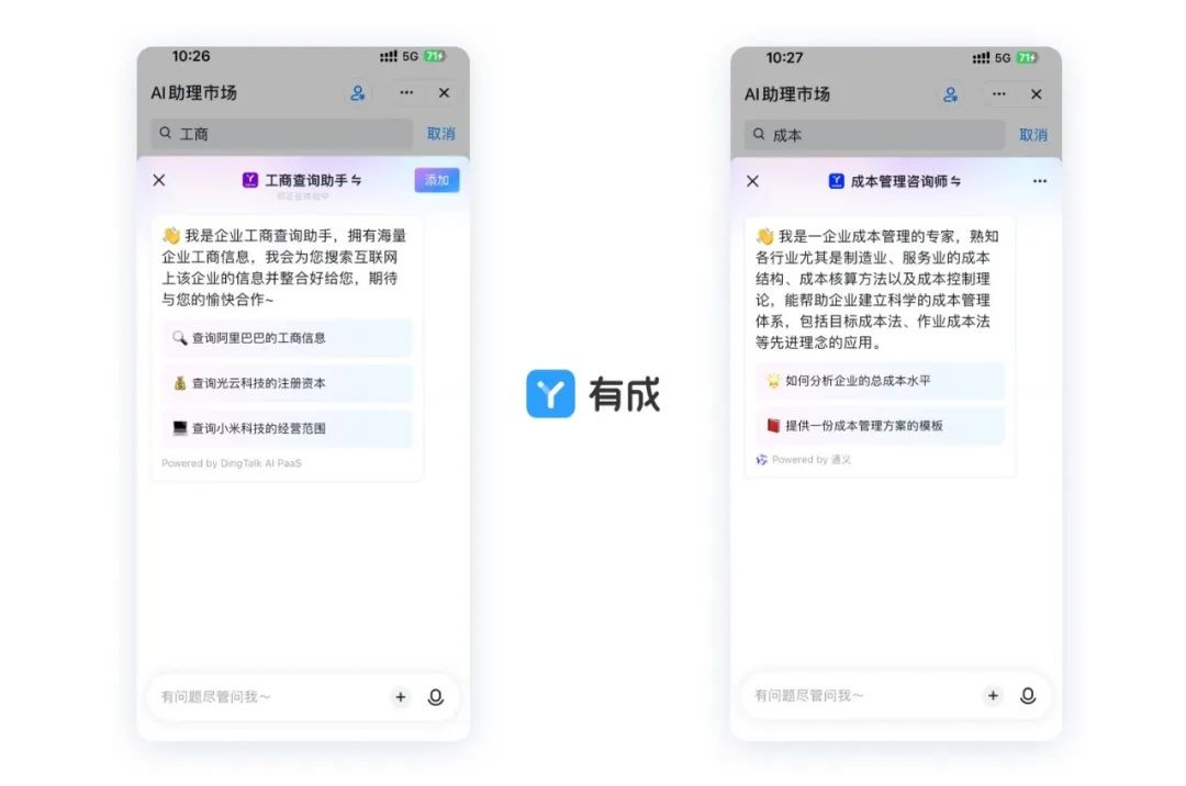在此背景下,有成果断抓住机遇,乘上人工智能技术助力企业服务行业变革的浪潮,于3月率先在钉钉上线了工商查询助手、成本管理咨询师两个AI助理,从有成现有业务场景出发,结合AI智能为企业提供更好的服务。